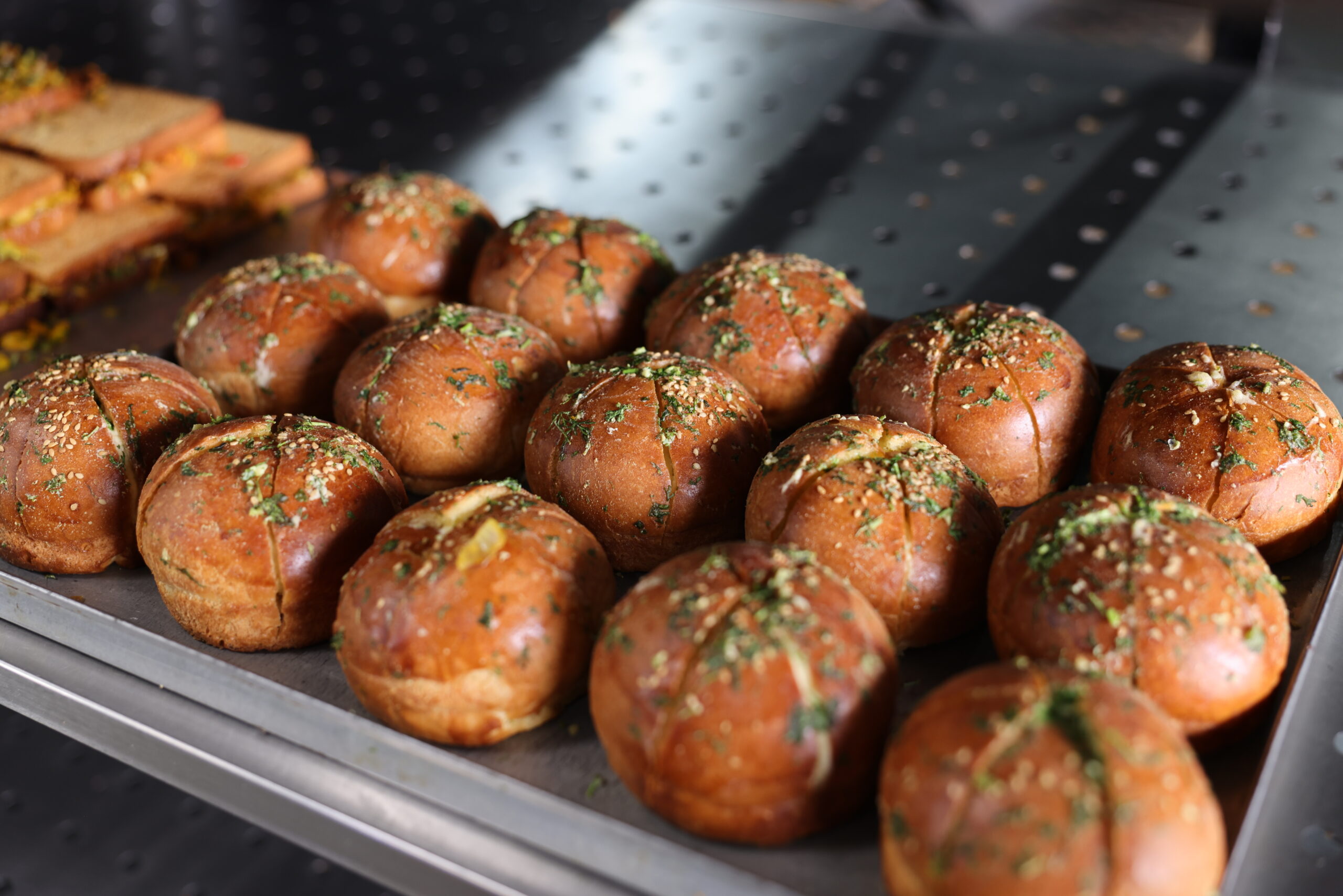 A savory and sweet Korean street food snack, featuring a fluffy bun with a creamy cheese filling and a crisp garlic butter topping.